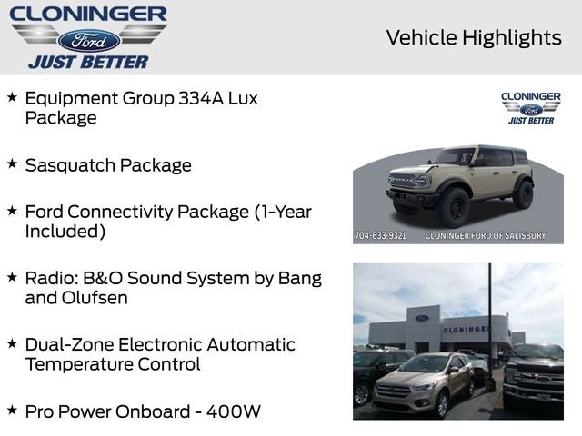 2026 Ford Bronco Badlands 2-Door Intelligent Access with Lock/Unlock, 360-Degree Camera, 4.7 Final Drive Ratio, Adaptive Cruise Control, Ambient Footwell Lighting, Connected Navigation, Driver and Front Passenger Illuminated Sliding Visor Vanity Mirrors, Dual Smart Charging USB Ports, Dual-Zone Electronic Automatic Temperature Control, Equipment Group 334A Lux Package, Evasive Steering Assist, Ford Connectivity Package (1-Year Included), Front Parking Sensors, Front Row Heated Seats, Front Stabilizer Disconnect, Heated Steering Wheel, High Clearance Suspension, Marine Grade Vinyl Heated Bucket Seats, Position-Sensitive Bilstein Shock Absorbers, Pro Power Onboard - 400W, Radio: B&O Sound System by Bang and Olufsen, Rear Parking Sensors, Sasquatch Package, Sideview Mirrors, Wheels: 17 Carbonized Gray-Painted Aluminum. ++ PRICE INCLUDES ALL REBATES AND FINANCING THRU FORD MOTOR CREDIT ++ Cloninger Ford Of Salisbury Will Pay TOP $$$ FOR YOUR TRADE-IN! ++ Cloninger Ford Of Salisbury – JUST BETTER!!! ++ Better People, Better Experience !!! One Year Appearance Package $1298 Not Included In Sales Price *PAINT PROTECTION Protects against fading, weather induced cracking or peeling, oxidation or loss of gloss. *FABRIC PROTECTION Protects against any normal oil-or water-based spills on the fabric. *VINYL & LEATHER PROTECTION Protects against fading and permanent staining caused by food or drink. Price includes: $750 - Retail Customer Cash. Exp. 04/30/2026