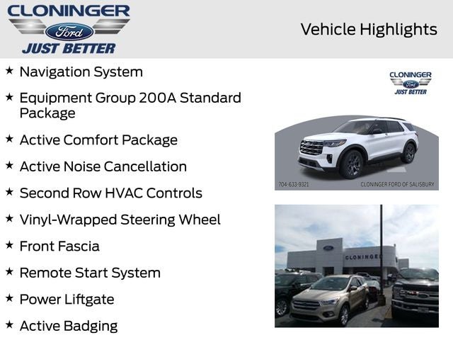 2026 Ford Explorer Active Active Comfort Package, Equipment Group 200A Standard Package, Front Fascia, Heated ActiveX Seating Material Captain's Chairs, Heated Steering Wheel, Navigation System, Power Liftgate, Remote Start System, Unique Cloth Heated Captain's Chairs. 20/27 City/Highway MPG ++ PRICE INCLUDES ALL REBATES AND FINANCING THRU FORD MOTOR CREDIT ++ Cloninger Ford Of Salisbury Will Pay TOP $$$ FOR YOUR TRADE-IN! ++ Cloninger Ford Of Salisbury – JUST BETTER!!! ++ Better People, Better Experience !!! One Year Appearance Package $1298 Not Included In Sales Price *PAINT PROTECTION Protects against fading, weather induced cracking or peeling, oxidation or loss of gloss. *FABRIC PROTECTION Protects against any normal oil-or water-based spills on the fabric. *VINYL & LEATHER PROTECTION Protects against fading and permanent staining caused by food or drink. Price includes: $2500 - Retail Customer Cash. Exp. 03/31/2026
