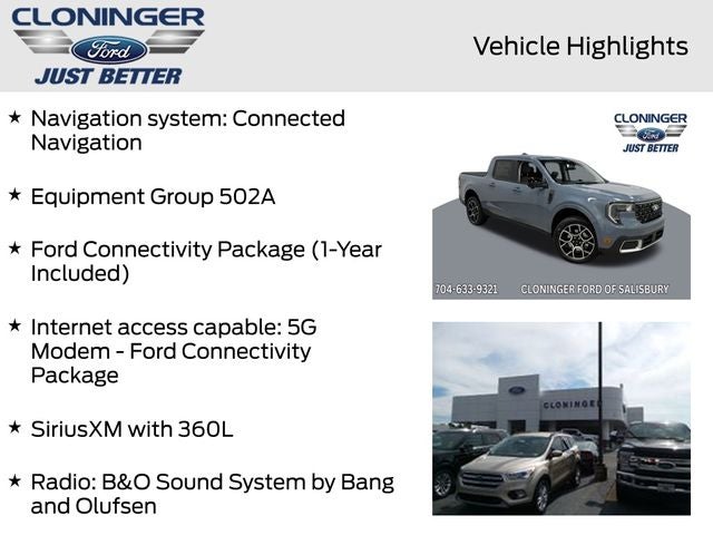 2026 Ford Maverick Lariat ActiveX Trimmed Heated Front Bucket Seats, Equipment Group 502A, Ford Connectivity Package (1-Year Included), Internet access capable: 5G Modem - Ford Connectivity Package, Navigation system: Connected Navigation, Radio: B&O Sound System by Bang and Olufsen, SiriusXM with 360L, SYNC 4 with Enhanced Voice Recognition, Wheels: 19 Machined Aluminum Painted. 22/30 City/Highway MPG ++ PRICE INCLUDES ALL REBATES AND FINANCING THRU FORD MOTOR CREDIT ++ Cloninger Ford Of Salisbury Will Pay TOP $$$ FOR YOUR TRADE-IN! ++ Cloninger Ford Of Salisbury – JUST BETTER!!! ++ Better People, Better Experience !!! One Year Appearance Package $1298 Not Included In Sales Price *PAINT PROTECTION Protects against fading, weather induced cracking or peeling, oxidation or loss of gloss. *FABRIC PROTECTION Protects against any normal oil-or water-based spills on the fabric. *VINYL & LEATHER PROTECTION Protects against fading and permanent staining caused by food or drink. Price includes: $500 - Retail Customer Cash. Exp. 04/30/2026