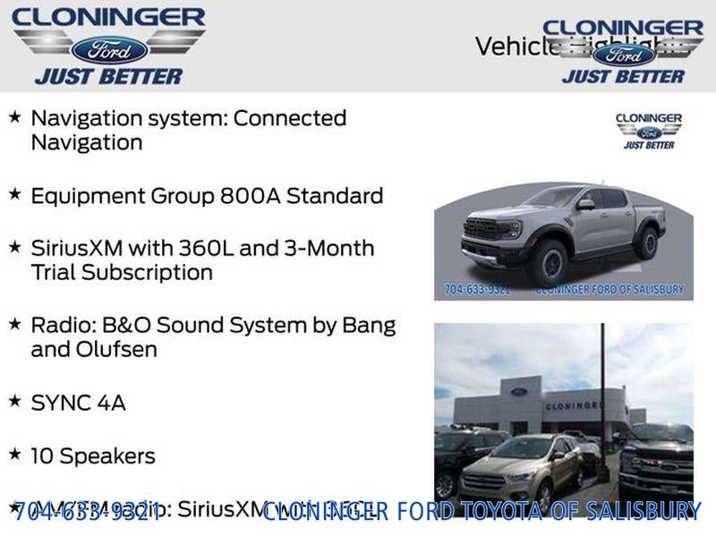 2026 Ford Ranger Raptor 4WD — Salisbury, NC — Best Price Conquer every trail and commute with this 2026 Ford Ranger Raptor, powered by a muscular V6 3.0L gasoline engine and advanced 4WD capability. Built for off-road performance and everyday comfort, this Ford Ranger Raptor comes equipped with a premium Off-Road Package that includes upgraded suspension, skid plates, and rugged tires to tackle rough terrain confidently. Remote Start adds convenience for chilly mornings or hot afternoons, while Adaptive Cruise Control enhances highway safety and reduces driver fatigue on long trips. Stay connected and on course with integrated Navigation and Android Auto, giving seamless smartphone integration and hands-free access to maps, music, and messaging. The interior blends durable materials with modern tech, making this truck equally at home at the worksite, on weekend adventures, or running city errands around Salisbury, NC. We're offering the best price on this 2026 Ford Ranger Raptor in the Salisbury area — great value for a high-performance, feature-packed pickup. Whether you need capability for off-road excursions or a comfortable daily driver with advanced safety and convenience features, this Ford Ranger Raptor is a top choice. Schedule a test drive today in Salisbury, NC and experience the power and versatility firsthand.