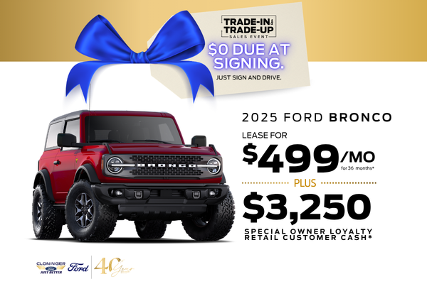 *Lease for $499/mo for 36 mos. with $499 cash due at signing. Taxes, title, license fees extra. No Security Deposit required. $0 down payment. Expires 4/30/26. With Equipment Group 222A. Not all buyers will qualify for Ford Credit Red Carpet Lease. Payments may vary; dealer determines price. Residency restrictions apply. Offer requires dealer contribution. Take new retail delivery from an authorized Ford Dealer's stock by 4/30/26. Program #33178: $3,250.00 additional cash back for current qualified owners of an eligible vehicle. Not compatible with other public offers. Compatible with ICI & Affinity. Proof of ownership required. Take delivery from dealer stock by 04/30/2026. See Cloninger Ford of Salisbury for qualifications and complete details. Cloninger Ford of Salisbury is not responsible for typographical errors. Photos for illustration only. Offers subject to change without notice. Offer expires 4/30/26.