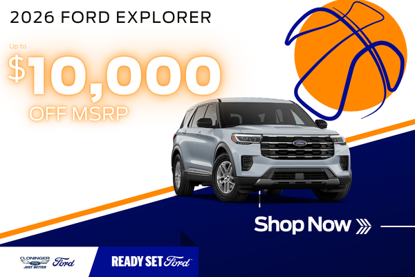 Savings of up to $10,000 off MSRP available on select new 2026 Ford Explorer models. Discount includes dealer discount and all applicable manufacturer incentives. Customer must qualify for all rebates and incentives to receive maximum savings. Conquest incentive available to current owners or lessees of eligible Jeep, Honda, Kia, Hyundai, or Toyota vehicles. Not all buyers will qualify. Plus tax, tag, title, registration, dealer fees, and destination charges. Vehicle availability may vary. Photos for illustration purposes only See Cloninger Ford of Salisbury for complete details. Cloninger Ford of Salisbury is not responsible for typographical errors. Offer subject to change without notice. Offer expires 3/31/26.