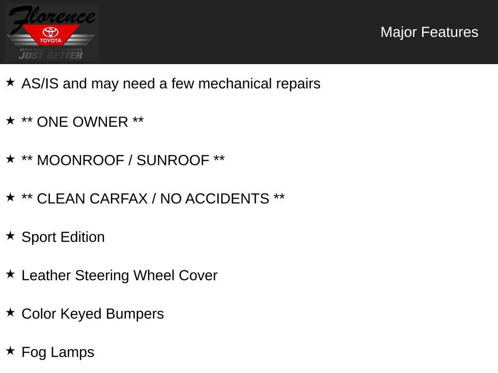 AS/IS and may need a few mechanical repairs, ** ONE OWNER **, ** MOONROOF / SUNROOF **, ** CLEAN CARFAX / NO ACCIDENTS **, 4Runner SR5, 4D Sport Utility, 3.4L V6 MPI DOHC, 4-Speed Automatic with Overdrive, RWD, 16 x 7JJ Aluminum Wheels, 4-Way Adjustable Headrests, Cloth Door Trim, Cloth Sport Seats, Color Keyed Bumpers, Color Keyed Grille, Fog Lamps, Leather Steering Wheel Cover, Metallic Trim Instrument Panel, Sport Edition, Sports Edition Badging.