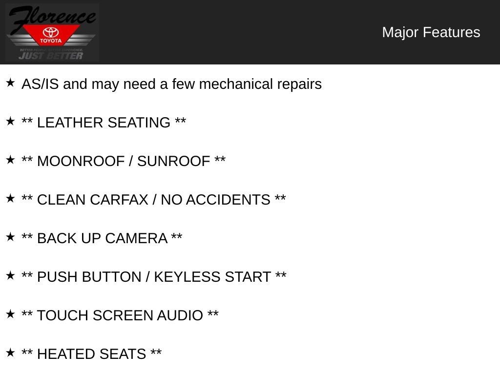 AS/IS and may need a few mechanical repairs, ** LEATHER SEATING **, ** MOONROOF / SUNROOF **, ** CLEAN CARFAX / NO ACCIDENTS **, ** BACK UP CAMERA **, ** PUSH BUTTON / KEYLESS START **, ** TOUCH SCREEN AUDIO **, ** HEATED SEATS **, ** COOLED SEATS **, ** Bluetooth® **, ** PREMIUM AUDIO SYSTEM **, ** RAIN SENSING WIPERS **, Avalon Hybrid Limited, 4D Sedan, 2.5L 4-Cylinder Atkinson-Cycle DOHC 16V, E-CVT Automatic, FWD, Automatic High Beams, Automatic temperature control, CD player, Dynamic Radar Cruise Control, Front dual zone A/C, Front fog lights, Fully automatic headlights, Memory seat, Power driver seat, Pre-Collision System, Rear air conditioning, Remote keyless entry, Steering wheel mounted audio controls, Technology Package.