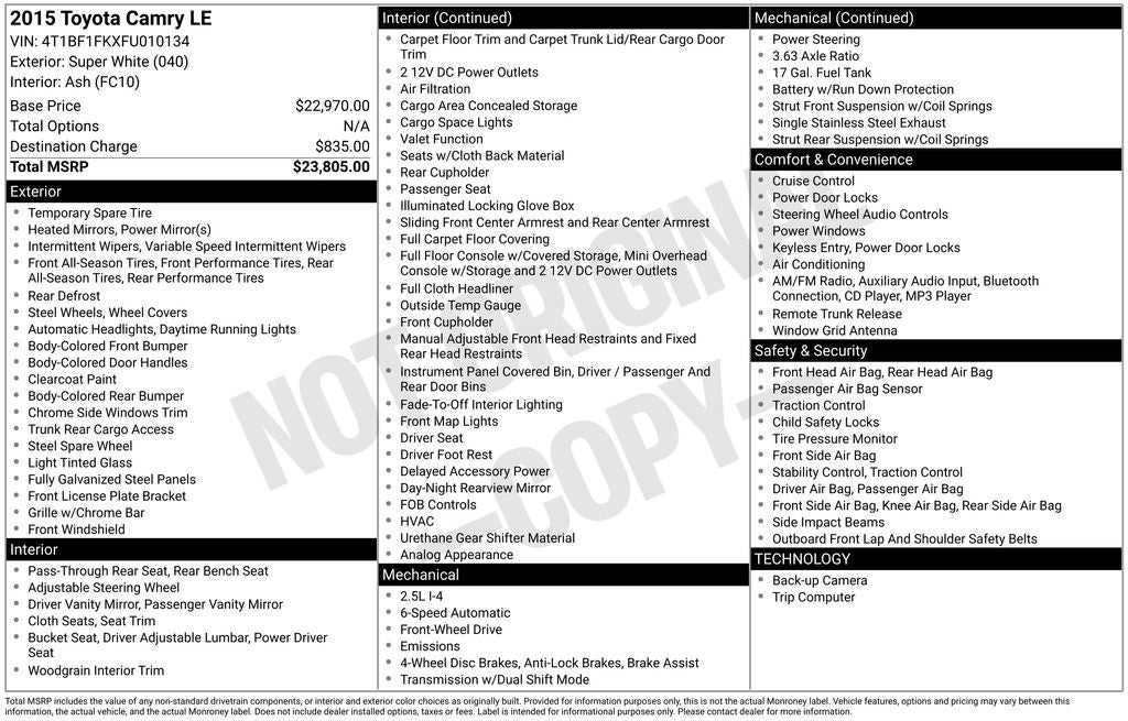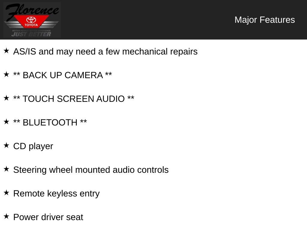 AS/IS and may need a few mechanical repairs, ** BACK UP CAMERA **, ** TOUCH SCREEN AUDIO **, ** Bluetooth® **, Camry LE, 4D Sedan, 2.5L I4 SMPI DOHC, 6-Speed Automatic, FWD, CD player, Delay-off headlights, Fully automatic headlights, Power driver seat, Remote keyless entry, Steering wheel mounted audio controls.