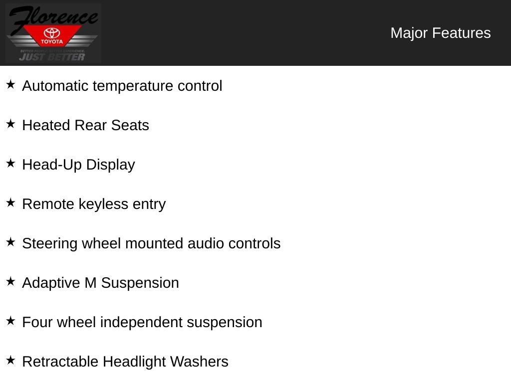 At Florence Toyota, come see how our USED CARS are JUST BETTER. We offer the following benefits: Lifetime Power Train (Some exclusions apply), 1st Year Maintenance, $500 Additional Trade In Appraisal, 72 Hour Vehicle Exchange Program, Yearly Vehicle Appraisal & Safety Inspection, VIP Loyalty Program, Routine Express Service, Courtesy Service Shuttle, Express Buying Service. Also, as an added benefit we will buy your vehicle even if you don't buy ours!! Call today (866)830-0793 or visit us at www.florencetoyota.com *Customer must trade-in a vehicle to receive $1,000 Trade Assist credit that is included in the online price. **Financing must be provided by a third-party lender using this dealership's assistance for Customer to receive $1,000 Financing Assist credit that is included in the online price. See dealer for complete details.
