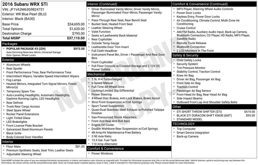 AS/IS and may need a few mechanical repairs, ** LEATHER SEATING **, ** CLEAN CARFAX / NO ACCIDENTS **, ** BACK UP CAMERA **, ** SIRIUS RADIO **, ** TOUCH SCREEN AUDIO **, ** Bluetooth® **, ** 4WD / AWD **, WRX STi, 4D Sedan, 2.5L DOHC Intercooled High-Boost DAVCS, Close-Ratio 6-Speed Manual, AWD, Aluminum Wheel Lock Kit, Auto-Dimming Mirror w/Compass & HomeLink, Automatic temperature control, Cargo Tray, CD player, Front dual zone A/C, Front fog lights, Off-Black Center Armrest Extension, Popular Package #3, Rear Bumper Applique, Remote keyless entry, SPT Carbon Fiber Trunk Trim, Steering wheel mounted audio controls.