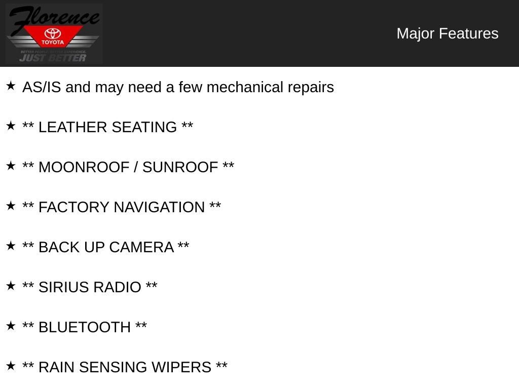 AS/IS and may need a few mechanical repairs, ** LEATHER SEATING **, ** MOONROOF / SUNROOF **, ** FACTORY NAVIGATION **, ** BACK UP CAMERA **, ** SIRIUS RADIO **, ** Bluetooth® **, ** RAIN SENSING WIPERS **, Avalon Limited, 4D Sedan, 3.5L V6 DOHC Dual VVT-i 24V, 6-Speed Automatic ECT-i, FWD, Auto High-beam Headlights, Automatic temperature control, CD player, Front dual zone A/C, Fully automatic headlights, Memory seat, Power driver seat, Rear air conditioning, Remote keyless entry, Steering wheel mounted audio controls.