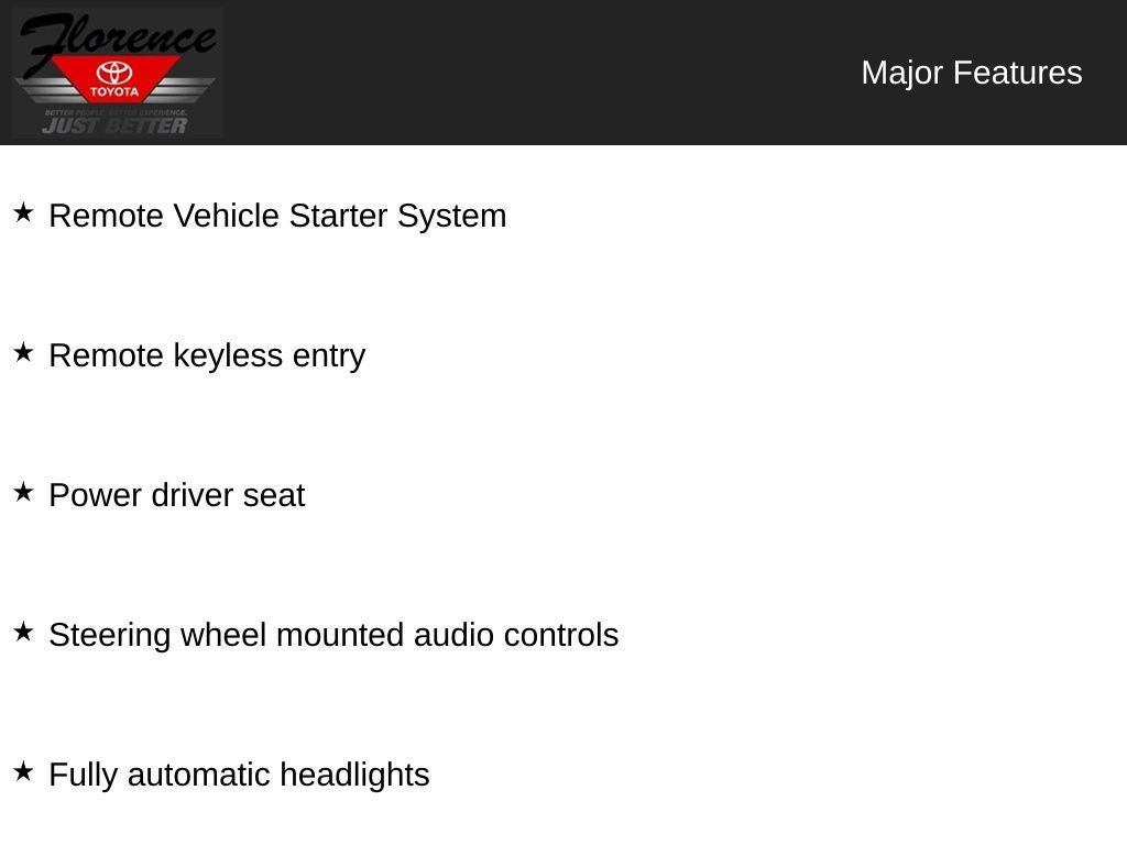 At Florence Toyota come see how our USED CARS are JUST BETTER . We offer the following benefits: Lifetime Power Train (Some exclusions apply), 1st Year Maintenance, $500 Additional Trade In Appraisal, 72 Hour Vehicle Exchange Program, Yearly Vehicle Appraisal & Safety Inspection, VIP Loyalty Program, Routine Express Service, Courtesy Service Shuttle, Express Buying Service. Also, as an added benefit we will buy your vehicle even if you don't buy ours!! Call today (866)830-0793or visit us at www.florencetoyota.com *Customer must trade-in a vehicle to receive $1,000 Trade Assist credit that is included in the online price. **Financing must be provided by a third-party lender using this dealership’s assistance for Customer to receive $1,000 Financing Assist credit that is included in the online price. See dealer for complete details.