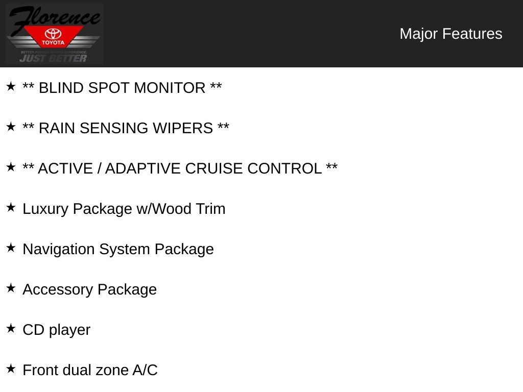 At Florence Toyota come see how our USED CARS are JUST BETTER. We offer the following benefits: Lifetime Power Train (Some exclusions apply), 1st Year Maintenance, $500 Additional Trade In Appraisal, 72 Hour Vehicle Exchange Program, Yearly Vehicle Appraisal & Safety Inspection, VIP Loyalty Program, Routine Express Service, Courtesy Service Shuttle, Express Buying Service. Also, as an added benefit we will buy your vehicle even if you don't buy ours!! Call today (866)830-0793 or visit us at www.florencetoyota.com *Customer must trade-in a vehicle to receive $1,000 Trade Assist credit that is included in the online price. **Financing must be provided by a third-party lender using this dealership's assistance for Customer to receive $1,000 Financing Assist credit that is included in the online price. See dealer for complete details.