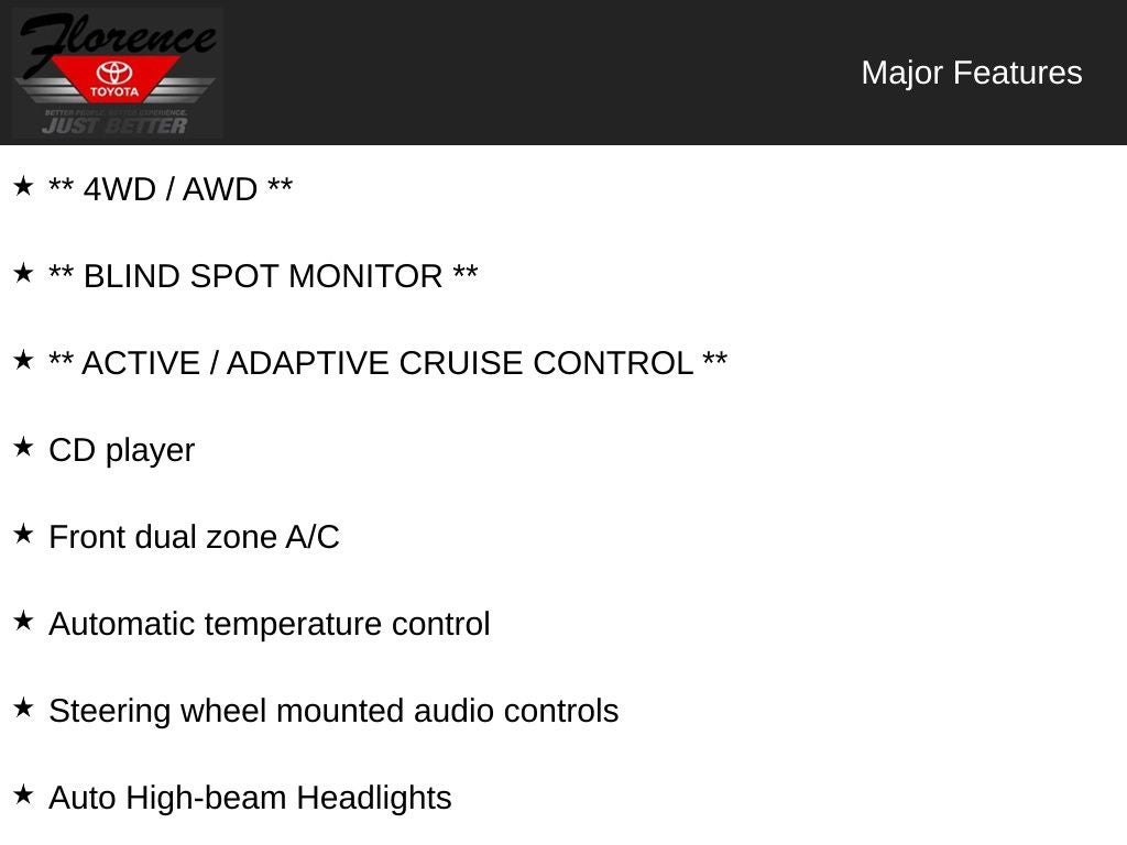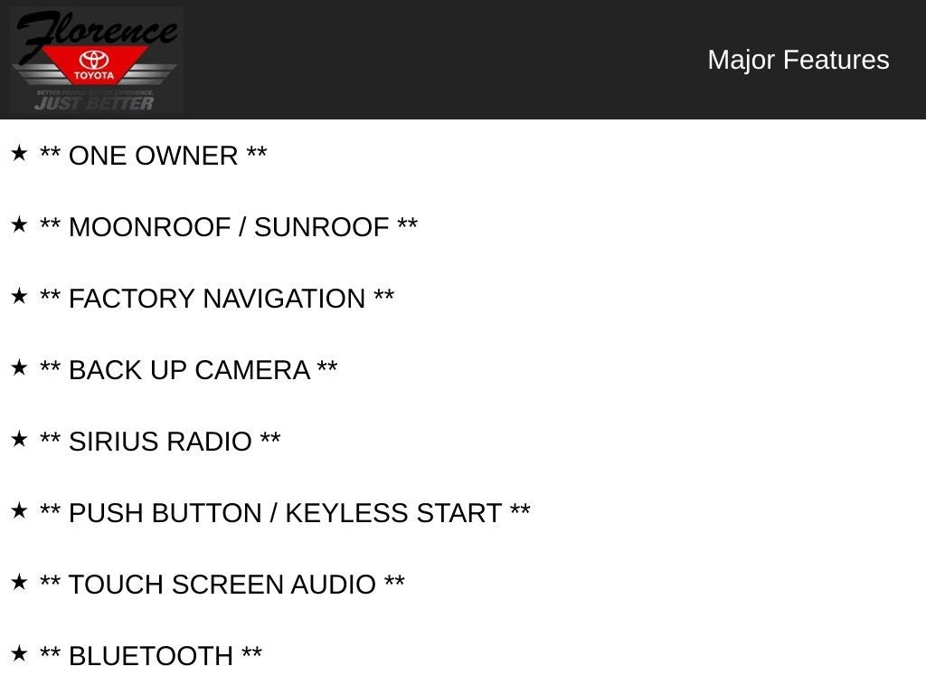 At Florence Toyota come see how our USED CARS are JUST BETTER . We offer the following benefits: Lifetime Power Train (Some exclusions apply), 1st Year Maintenance, $500 Additional Trade In Appraisal, 72 Hour Vehicle Exchange Program, Yearly Vehicle Appraisal & Safety Inspection, VIP Loyalty Program, Routine Express Service, Courtesy Service Shuttle, Express Buying Service. Also, as an added benefit we will buy your vehicle even if you don't buy ours!! Call today (866)830-0793or visit us at www.florencetoyota.com *Customer must trade-in a vehicle to receive $1,000 Trade Assist credit that is included in the online price. **Financing must be provided by a third-party lender using this dealership’s assistance for Customer to receive $1,000 Financing Assist credit that is included in the online price. See dealer for complete details.