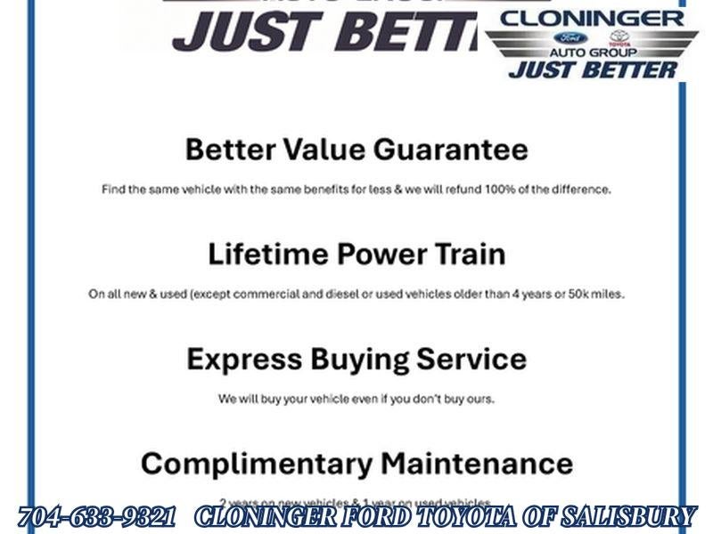 At Cloninger Ford -Toyota come see how we are your "JUST BETTER" dealership. Better People, Better Experience !!! We offer the following benefits: Better Value Guarantee, Lifetime Power Train (Some exclusions apply), $500 Additional Trade In Appraisal, 72 Hour Vehicle Exchange Program, Yearly Vehicle Appraisal & Safety Inspection, VIP Loyalty Program, Routine Express Service, Courtesy Service Shuttle, Express Buying Service. Also, as an added benefit we will buy your vehicle even if you don't buy ours!! One Year Appearance Protection $799 Not Included In Sales Price *PAINT PROTECTION Protects against fading, weather induced cracking or peeling, oxidation or loss of gloss. *FABRIC PROTECTION Protects against any normal oil-or water-based spills on the fabric. *VINYL & LEATHER PROTECTION Protects against fading and permanent staining caused by food or drink.