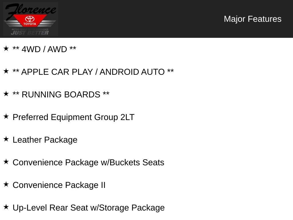 Convenience Package: Manual Tilt/telescoping Steering Column; Heated Steering Wheel; 10-Way Power Driver Seat with Lumbar; Floor Mounted Center Console; Dual-Zone Automatic Climate Control; Heated Driver and Front Outboard Passenger Seats; Front Bucket Seats. Convenience Package II: HD Rear Vision Camera; Premium Bose 7-Speaker Sound System; Power Sliding Rear Window with Rear Defogger; SiriusXM with 360L; 120-Volt Instrument Panel Power Outlet; Chevrolet Infotainment 3 Plus System Radio; 2 USB Ports; Universal Home Remote; HD Radio. Leather Package: Perforated Leather-Appointed Front Seat Trim; Up-Level Rear Seat with Storage Package. Preferred Equipment Group 2LT: LED Cargo Area Lighting; Hitch Guidance; Rear Vision Camera; Rear 60/40 Folding Bench Seat (folds Up); Bluetooth® For Phone; Remote Vehicle Starter System; 2 USB Ports (first Row); Electric Rear-Window Defogger; Theft Deterrent System (unauthorized Entry); 170 Amps Alternator; Auxiliary External Transmission Oil Cooler; LT275/65R18C MT BW Tires; Compass; 4.2" Diagonal Color Display Driver Info Center; Electrical Lock Control Steering Column; Trailering Package; Front LED Fog Lamps; Suspension Package; Steering Wheel Audio Controls; Single-Zone Manual/semi-Automatic Air Conditioning; Color-Keyed Carpeting Floor Covering; OnStar and Chevrolet Connected Services Capable; Power Front Windows with Passenger Express Down; 4-Way Manual Driver Seat Adjuster; 2-Speed Transfer Case; Deep-Tinted Glass; 6-Speaker Audio System; All-Weather Floor Liner; High Gloss Black Mirror Caps; Dual Exhaust with Polished Outlets; Steering Wheel Mounted Electronic Cruise Control; Power Rear Windows with Express Down; Performance Red Recovery Hooks; Manual Tilt-Wheel Steering Column; High Gloss Black Grille; Power Front Windows with Driver Express Up/down; Leather Wrapped Steering Wheel; Rear Dual USB Charging-Only Ports; Keyless Open and Start; LED Reflector Headlamps; 12-Volt Rear Auxiliary Power Outlet; 18" X 8.5" Black Painted Aluminum Wheels; Heavy-Duty Rear Locking Differential; Power Door Locks. Integrated Trailer Brake Controller. **Equipment listed is based on original vehicle build and subject to change. Please confirm the accuracy of the included equipment by calling the dealer prior to purchase.**
