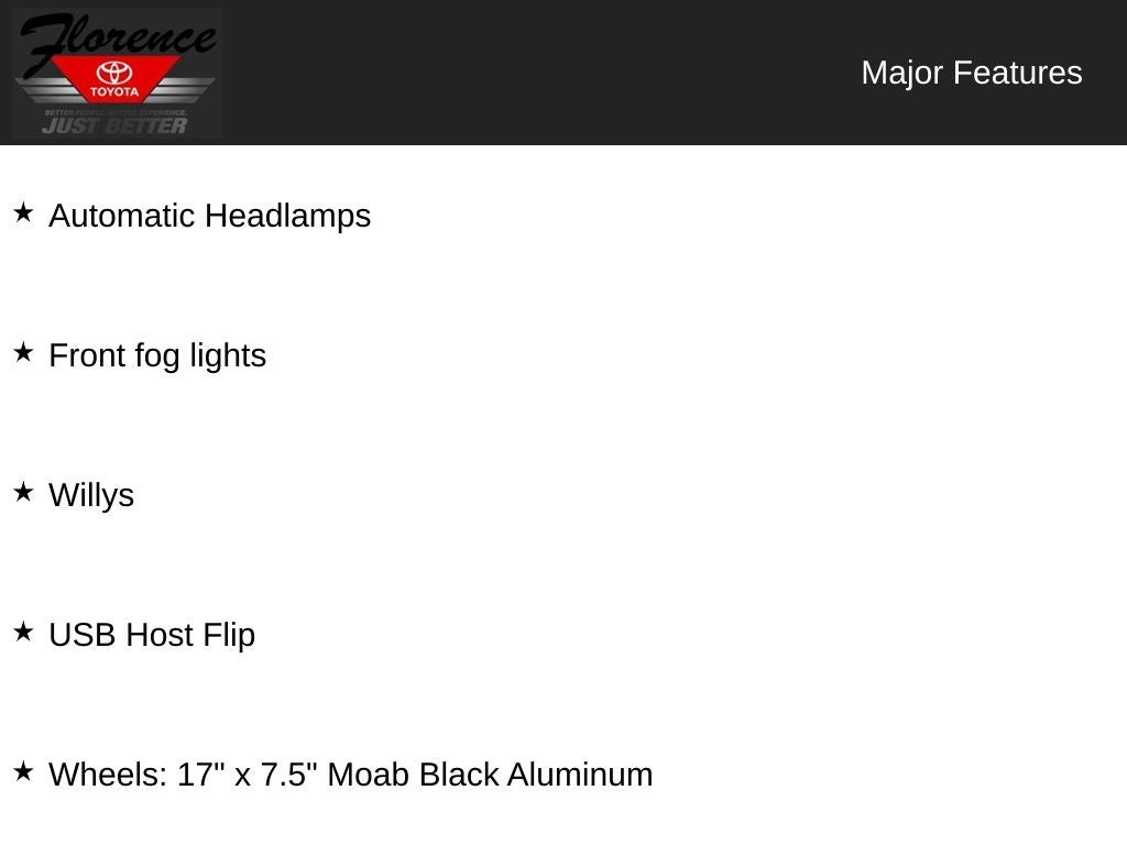 Convenience Group: Remote Start System; Universal Garage Door Opener. Technology Group: Google Android Auto; Cluster 7.0" TFT Color Display; SiriusXM Satellite Radio; USB Host Flip; Integrated Center Stack Radio; 7.0" Touchscreen Display; Air Conditioning with Auto Temp Control; Uconnect 4 Radio with 7" Display; Apple CarPlay; Air Filtering; GPS Antenna Input. Quick Order Package 22W Willys: Willys; Speed Sensitive Power Locks; Anti-Lock 4-Wheel Disc HD Brakes; Automatic Headlamps; Leather Wrapped Steering Wheel; Deep Tint Sunscreen Windows; Black Trail Rated Badge; 4-Wheel Drive Swing Gate Decal; Black Grille; MOPAR All-Weather Floor Mats; Willys Hood Decal; Rock Protection Sill Rails; LT255/75R17C Tires; Front 1-Touch Down Power Windows; 97 MPH Vehicle Max Speed Calibration; Power Heated Mirrors; Wrangler Decal; Matte Black Jeep Badge; Security Alarm; 17" X 7.5" Moab Black Aluminum Wheels; Remote Keyless Entry; Sun Visors with Illuminated Vanity Mirrors; LED Headlamp and Fog Lamp Group. Quick Order Package 23W Willys: Willys; Speed Sensitive Power Locks; Anti-Lock 4-Wheel Disc HD Brakes; Automatic Headlamps; Leather Wrapped Steering Wheel; Deep Tint Sunscreen Windows; Black Trail Rated Badge; 4-Wheel Drive Swing Gate Decal; Black Grille; MOPAR All-Weather Floor Mats; Willys Hood Decal; Rock Protection Sill Rails; LT255/75R17C Tires; Front 1-Touch Down Power Windows; 97 MPH Vehicle Max Speed Calibration; Power Heated Mirrors; Wrangler Decal; Matte Black Jeep Badge; Security Alarm; 17" X 7.5" Moab Black Aluminum Wheels; Remote Keyless Entry; Sun Visors with Illuminated Vanity Mirrors; LED Headlamp and Fog Lamp Group. Black 3-Piece Hard Top. SiriusXM Satellite Radio. Ocean Blue Metallic CC. MOPAR All-Weather Floor Mats. **Equipment listed is based on original vehicle build and subject to change. Please confirm the accuracy of the included equipment by calling the dealer prior to purchase.**