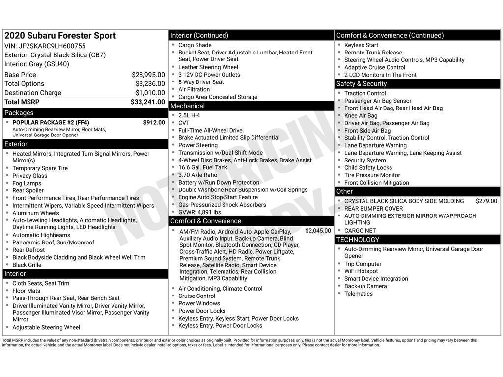 Discover this like-new 2020 Subaru Forester Sport - a low-mileage gem located in Florence, SC. Designed for drivers who want capability and comfort, this Subaru Forester Sport features Subaru's legendary AWD and a fuel-efficient 4-cylinder 2.5L gasoline engine, delivering confident handling in rain, snow, and on back roads. Equipped for everyday convenience and modern connectivity, this Subaru Forester includes Remote Start for cool mornings or warm-up on chilly evenings, Hands Free Bluetooth® to keep you connected safely, and Android Auto for seamless smartphone integration. The Back-Up Camera enhances visibility and parking confidence, while Automatic Climate Control maintains the perfect cabin temperature for every drive. Sport trim details add a blend of athletic styling and functional features - ideal for active lifestyles, commuting, or weekend getaways. The low mileage means you get nearly-new reliability without the new-car wait. Comfortable seating, a well-designed interior, and thoughtful tech make every trip enjoyable, whether it's a short errand around Florence or an extended road trip. This 2020 Subaru Forester Sport is ready to provide dependable AWD performance, modern tech, and everyday practicality. Visit Florence, SC to see this low-mileage Subaru Forester for yourself and experience why Subaru owners value safety, versatility, and long-term dependability. Schedule a viewing today and take the next step toward owning a superbly maintained crossover.