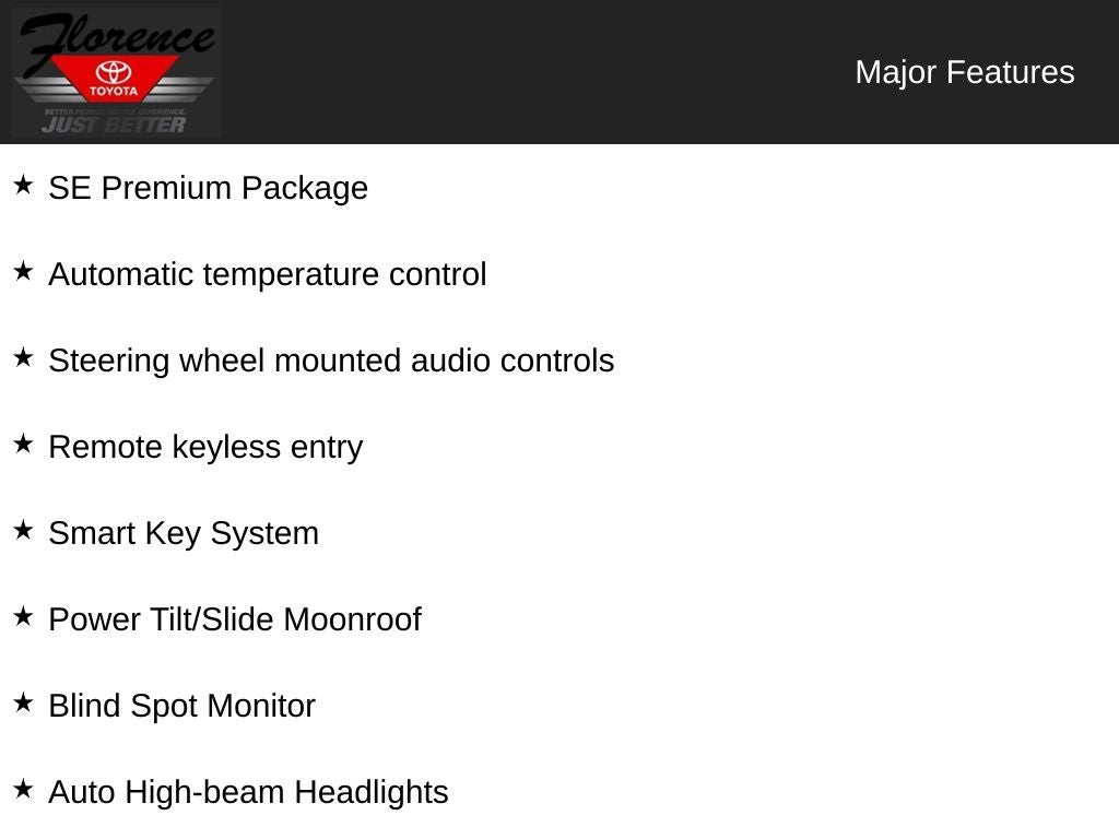 The Corolla SE Premium Package further enhances your driving pleasure with features like a Power Tilt/Slide Moonroof, Sliding Sunshade, Blind Spot Monitor, Smart Key System, and Remote Keyless Entry.