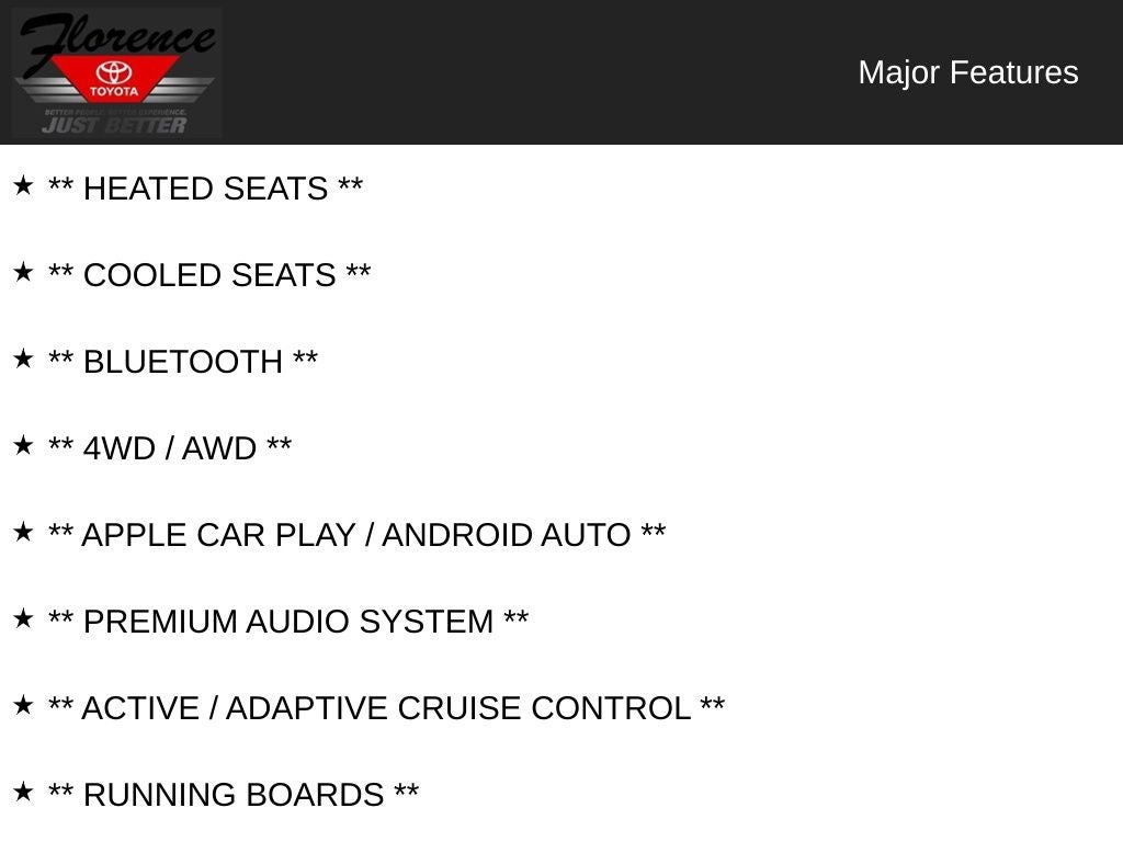 At Florence Toyota come see how our USED CARS are JUST BETTER. We offer the following benefits: Lifetime Power Train (Some exclusions apply), 1st Year Maintenance, $500 Additional Trade In Appraisal, 72 Hour Vehicle Exchange Program, Yearly Vehicle Appraisal & Safety Inspection, VIP Loyalty Program, Routine Express Service, Courtesy Service Shuttle, Express Buying Service. Also, as an added benefit we will buy your vehicle even if you don't buy ours!! Call today (866)830-0793 or visit us at www.florencetoyota.com *Customer must trade-in a vehicle to receive $1,000 Trade Assist credit that is included in the online price. **Financing must be provided by a third-party lender using this dealership's assistance for Customer to receive $1,000 Financing Assist credit that is included in the online price. See dealer for complete details.