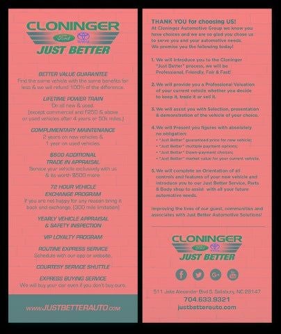 At Cloninger Ford of Hickory come see how we are your JUST BETTER dealership. We offer the following benefits: Better Value Guarantee, 1st Year Maintenance, $500 Additional Trade In Appraisal, 72 Hour Vehicle Exchange Program, Yearly Vehicle Appraisal & Safety Inspection, VIP Loyalty Program, Routine Express Service, Courtesy Service Shuttle, Express Buying Service. Also, as an added benefit we will buy your vehicle even if you don't buy ours!! Call today (855)987-7457or visit us at www.cloningerfordofhickory.com *Customer must trade-in a vehicle to receive $1,000 Trade Assist credit that is included in the online price. **Financing must be provided by a third-party lender using this dealership’s assistance for Customer to receive $1,000 Financing Assist credit that is included in the online price. Does not include sales tax, DMV Fees, any lender fees for financing, plus dealer related fees for $899 doc and vehicle prep. See dealer for complete details One Year Appearance Package $799 Not Included In Sales Price *PAINT PROTECTION Protects against fading, weather induced cracking or peeling, oxidation or loss of gloss. *FABRIC PROTECTION Protects against any normal oil-or water-based spills on the fabric. *VINYL & LEATHER PROTECTION Protects against fading and permanent staining caused by food or drink.