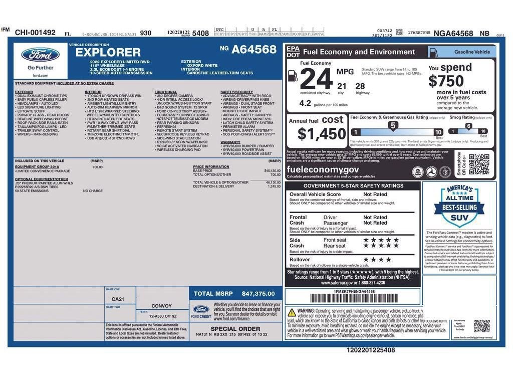 Equipment Group 301A: 3.58 Non-Limited-slip Rear Axle Ratio; Leather Heated and Ventilated Captain's Chairs; 10-Speed Automatic Transmission; 2.3L EcoBoost I-4 Engine; P255/55R20 AS BSW Tires; TBD GVWR; 20" Premium Painted Aluminum Wheels; B&O Sound System by Bang and Olufsen. Limited Convenience Package: Memory Driver's Seat; Power Tilt/telescoping Steering Column; Hands-Free Foot-Activated Liftgate; 3rd Row PowerFold Seat; 110V/150W AC Power Outlet; Sideview Mirrors with Gloss Black Caps. **Equipment listed is based on original vehicle build and subject to change. Please confirm the accuracy of the included equipment by calling the dealer prior to purchase.**
