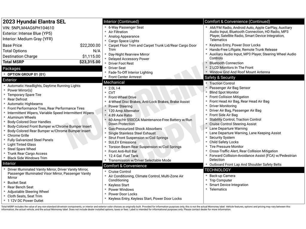 Discover the exceptional value of this 2023 Hyundai Elantra SEL, a meticulously maintained one-owner vehicle with a clean CARFAX history. This sedan boasts a striking blue exterior and a well-equipped interior, making it the perfect choice for the discerning driver.