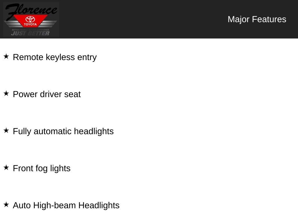 At Florence Toyota come see how our USED CARS are JUST BETTER . We offer the following benefits: Lifetime Power Train (Some exclusions apply), 1st Year Maintenance, $500 Additional Trade In Appraisal, 72 Hour Vehicle Exchange Program, Yearly Vehicle Appraisal & Safety Inspection, VIP Loyalty Program, Routine Express Service, Courtesy Service Shuttle, Express Buying Service. Also, as an added benefit we will buy your vehicle even if you don't buy ours!! Call today (866)830-0793 or visit us at www.florencetoyota.com *Customer must trade-in a vehicle to receive $1,000 Trade Assist credit that is included in the online price. **Financing must be provided by a third-party lender using this dealership's assistance for Customer to receive $1,000 Financing Assist credit that is included in the online price. See dealer for complete details.