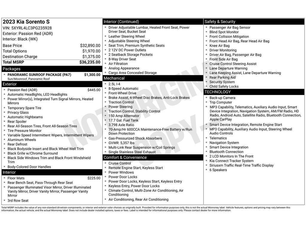 This mid-size suv offers Apple CarPlay for seamless connectivity. This vehicle is a certified CARFAX 1-owner. It has a clean CARFAX vehicle history report. The state of the art park assist system will guide you easily into any spot. The installed navigation system will keep you on the right path. See what's behind you with the back up camera on this unit. Bluetooth® technology is built into this unit, keeping your hands on the steering wheel and your focus on the road. with XM/Sirus Satellite Radio you are no longer restricted by poor quality local radio stations while driving this model. Anywhere on the planet, you will have hundreds of digital stations to choose from. This model utilizes collision avoidance to enhance safety by automatically detecting and evading potential accidents. Lane Keep Assist in the vehicle helps maintain safe driving by gently steering to stay within the lane. This 2023 Kia Sorento keeps you comfortable with Auto Climate.