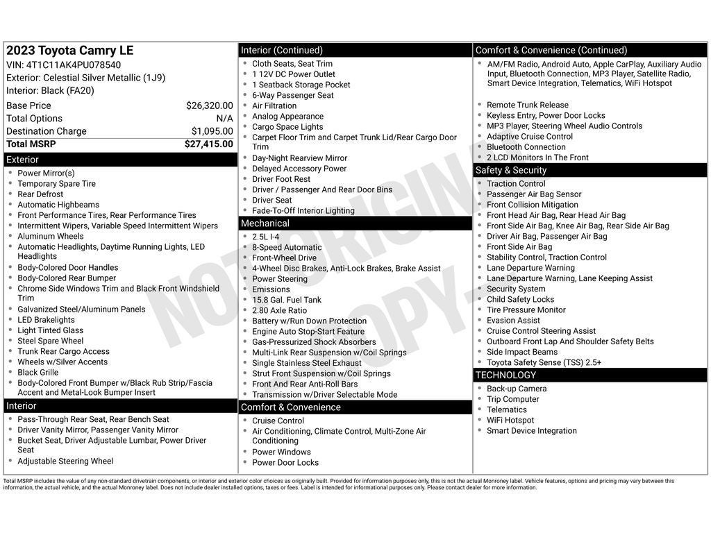 Inside, the cabin offers comfortable seating and a practical layout, with quality materials and driver-focused controls designed for everyday usability. The exterior presents a modern, aerodynamic profile that remains stylish and understated. With competitive pricing in Florence, SC, this Toyota Camry LE represents one of the best values available—priced to sell and ready for immediate delivery. Schedule a test drive today to experience the smooth ride, low ownership costs, and comprehensive feature set that make this 2023 Toyota Camry LE an exceptional choice.