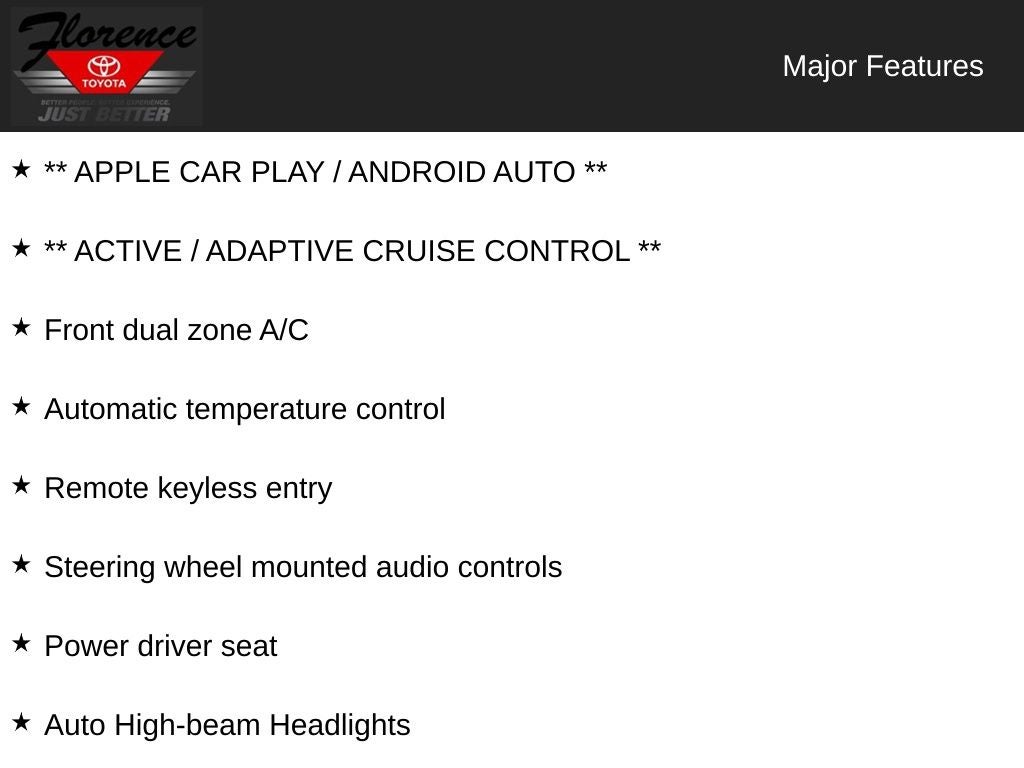At Florence Toyota, come see how our USED CARS are JUST BETTER. We offer the following benefits: Lifetime Power Train (Some exclusions apply), 1st Year Maintenance, $500 Additional Trade In Appraisal, 72 Hour Vehicle Exchange Program, Yearly Vehicle Appraisal & Safety Inspection, VIP Loyalty Program, Routine Express Service, Courtesy Service Shuttle, Express Buying Service. Also, as an added benefit we will buy your vehicle even if you don't buy ours!! Call today (866)830-0793 or visit us at www.florencetoyota.com *Customer must trade-in a vehicle to receive $1,000 Trade Assist credit that is included in the online price. **Financing must be provided by a third-party lender using this dealership's assistance for Customer to receive $1,000 Financing Assist credit that is included in the online price. See dealer for complete details.
