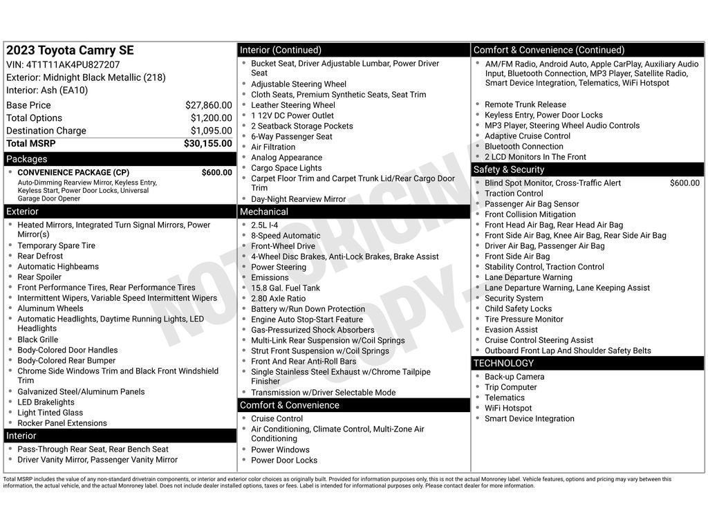 Good News! This certified CARFAX 1-owner vehicle has only had one owner before you. This unit has a clean CARFAX vehicle history report. This mid-size car comes equipped with Android Auto for seamless smartphone integration on the road. This 2023 Toyota Camry offers Apple CarPlay for seamless connectivity. This mid-size car keeps you comfortable with Auto Climate. Protect the vehicle from unwanted accidents with a cutting edge backup camera system. This Toyota Camry's blind spot monitor enhances safety. It's Cross-Traffic Alert: Safeguarding you from unexpected traffic when reversing. Electronic Stability Control is one of many advanced safety features on this mid-size car. This mid-size car features a hands-free Bluetooth® phone system. This 2023 Toyota Camry features a HomeLink System. The leather seats in this unit are a must for buyers looking for comfort, durability, and style.