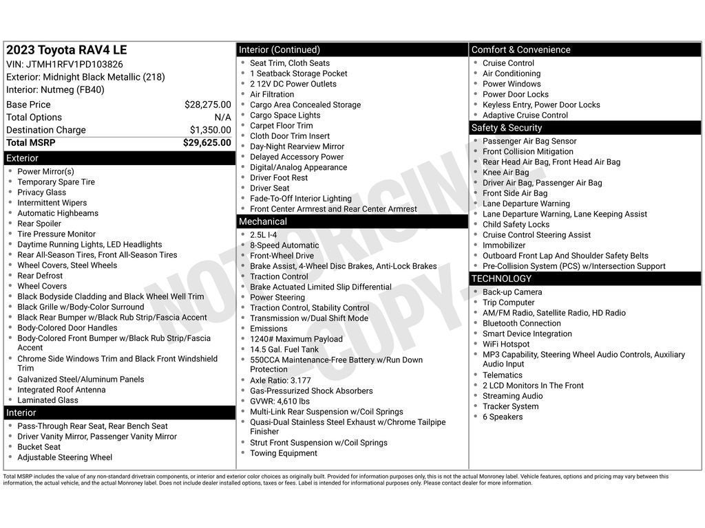See what's behind you with the back up camera on the Toyota RAV4. Our dealership has already run the CARFAX report and it is clean. A clean CARFAX is a great asset for resale value in the future. Apple CarPlay: Seamless smartphone integration for this vehicle - stay connected and entertained on the go! Good News! This certified CARFAX 1-owner vehicle has only had one owner before you. This Toyota RAV4 features a hands-free Bluetooth® phone system. This model comes equipped with Android Auto for seamless smartphone integration on the road. This small suv has a 4 Cyl, 2.5L high output engine. This 2023 Toyota RAV4 is front wheel drive. This small suv is painted with a sleek and sophisticated black color. Electronic Stability Control is one of many advanced safety features on this 2023 Toyota RAV4 . Easily set your speed in this Toyota RAV4 with a state of the art cruise control system. Increase or decrease velocity with the touch of a button.