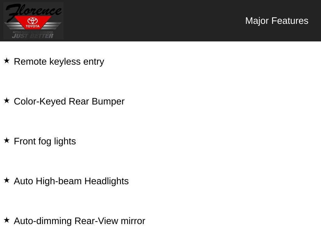 At Florence Toyota, come see how our USED CARS are JUST BETTER. We offer the following benefits: Lifetime Power Train (Some exclusions apply), 1st Year Maintenance, $500 Additional Trade In Appraisal, 72 Hour Vehicle Exchange Program, Yearly Vehicle Appraisal & Safety Inspection, VIP Loyalty Program, Routine Express Service, Courtesy Service Shuttle, Express Buying Service. Also, as an added benefit we will buy your vehicle even if you don't buy ours!! Call today (866)830-0793 or visit us at www.florencetoyota.com *Customer must trade-in a vehicle to receive $1,000 Trade Assist credit that is included in the online price. **Financing must be provided by a third-party lender using this dealership’s assistance for Customer to receive $1,000 Financing Assist credit that is included in the online price. See dealer for complete details.