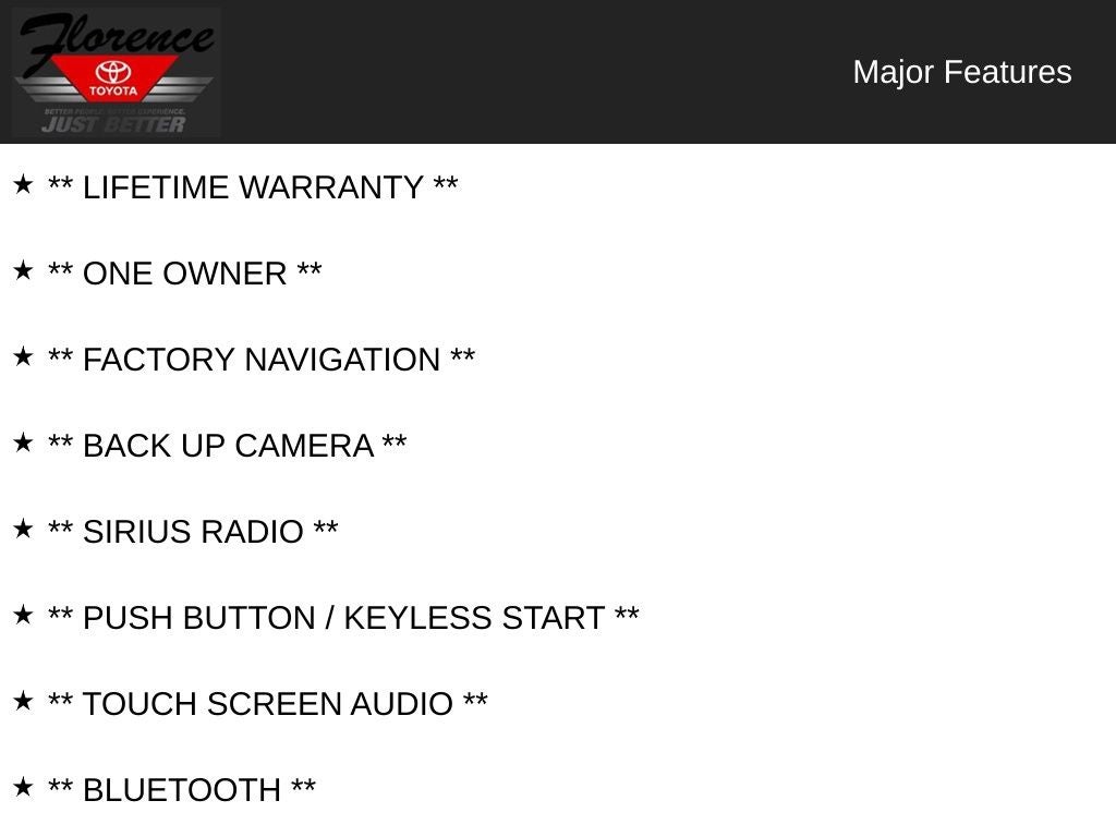 At Florence Toyota, come see how our USED CARS are JUST BETTER. We offer the following benefits: Lifetime Power Train (Some exclusions apply), 1st Year Maintenance, $500 Additional Trade In Appraisal, 72 Hour Vehicle Exchange Program, Yearly Vehicle Appraisal & Safety Inspection, VIP Loyalty Program, Routine Express Service, Courtesy Service Shuttle, Express Buying Service. Also, as an added benefit we will buy your vehicle even if you don't buy ours!! Call today (866)830-0793 or visit us at www.florencetoyota.com *Customer must trade-in a vehicle to receive $1,000 Trade Assist credit that is included in the online price. **Financing must be provided by a third-party lender using this dealership's assistance for Customer to receive $1,000 Financing Assist credit that is included in the online price. See dealer for complete details.