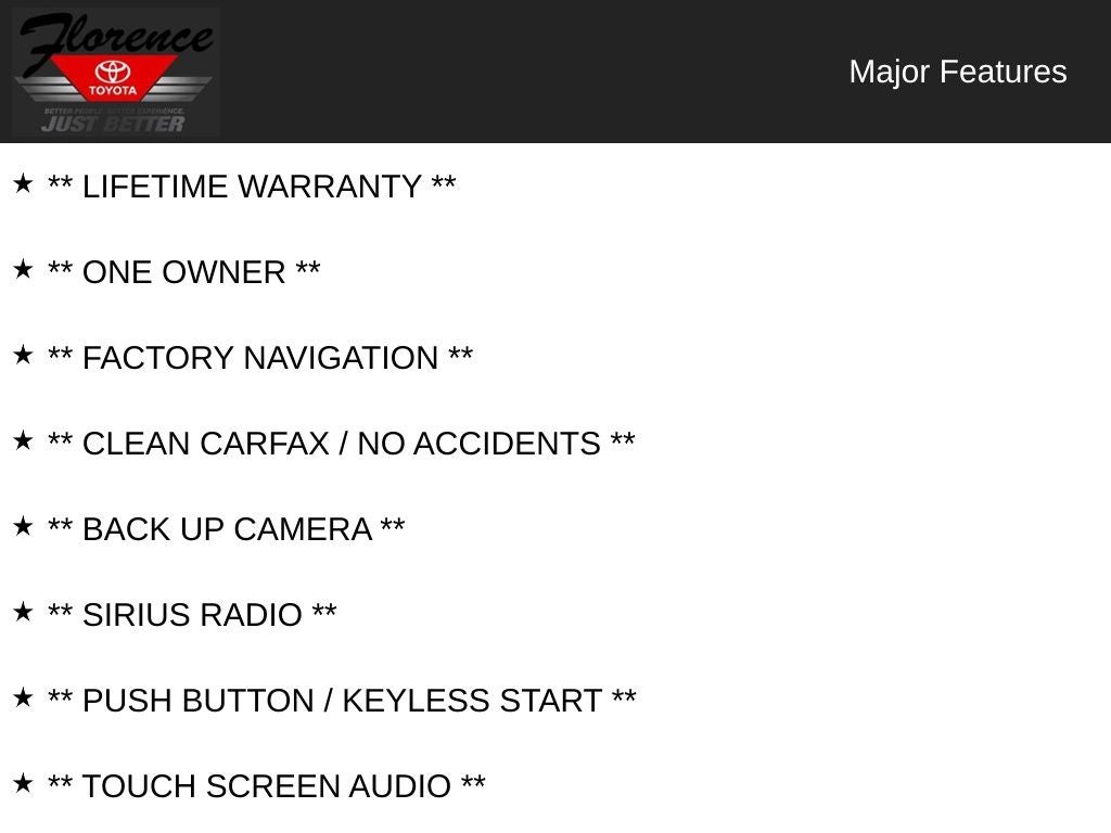 At Florence Toyota, we are committed to providing our customers with an exceptional buying experience. Come see how our USED CARS are JUST BETTER. We offer a Lifetime Powertrain Warranty, 1st Year Maintenance, $500 Additional Trade-In Appraisal, a 72-Hour Vehicle Exchange Program, and more. We'll even buy your vehicle, even if you don't buy ours! Call (866)830-0793 or visit www.florencetoyota.com to experience the difference.