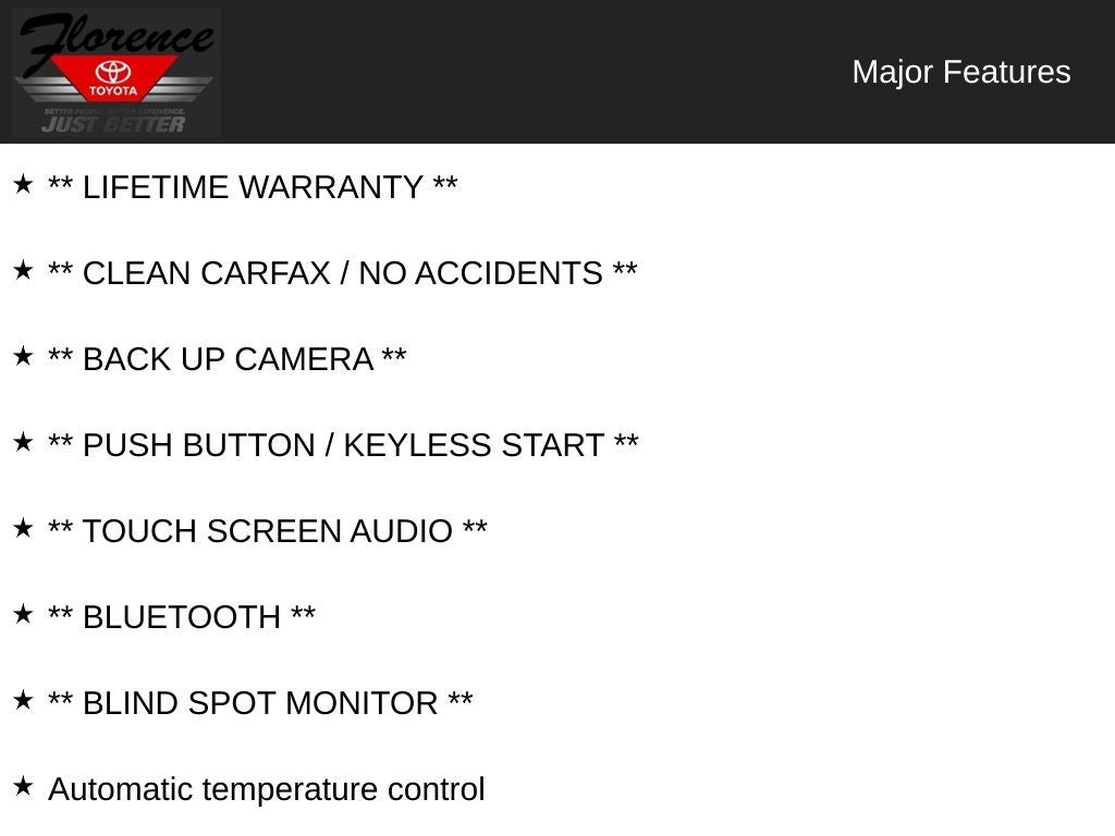 At Florence Toyota come see how our USED CARS are JUST BETTER. We offer the following benefits: Lifetime Power Train (Some exclusions apply), 1st Year Maintenance, $500 Additional Trade In Appraisal, 72 Hour Vehicle Exchange Program, Yearly Vehicle Appraisal & Safety Inspection, VIP Loyalty Program, Routine Express Service, Courtesy Service Shuttle, Express Buying Service. Also, as an added benefit we will buy your vehicle even if you don't buy ours!! Call today (866)830-0793 or visit us at www.florencetoyota.com *Customer must trade-in a vehicle to receive $1,000 Trade Assist credit that is included in the online price. **Financing must be provided by a third-party lender using this dealership's assistance for Customer to receive $1,000 Financing Assist credit that is included in the online price. See dealer for complete details.