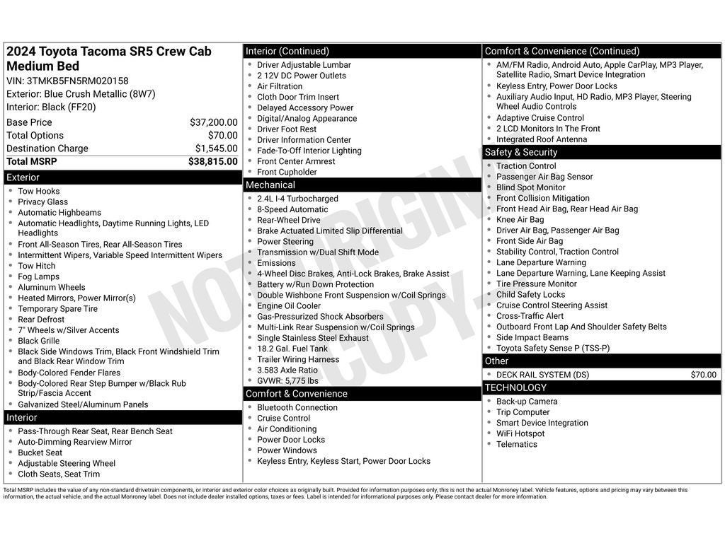 This vehicle has been meticulously maintained and is certified as a one-owner with a clean CARFAX report, giving you the peace of mind of knowing its history. With low mileage and an impressive list of features, the 2024 Toyota Tacoma SR5 is the perfect choice for those seeking a reliable and capable pickup that can handle any adventure.