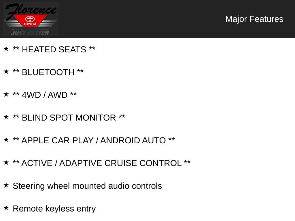 At Florence Toyota, we're committed to providing our customers with the best possible experience. Come see how our USED CARS are JUST BETTER. We offer the following benefits: Lifetime Power Train (Some exclusions apply), 1st Year Maintenance, $500 Additional Trade In Appraisal, 72 Hour Vehicle Exchange Program, Yearly Vehicle Appraisal & Safety Inspection, VIP Loyalty Program, Routine Express Service, Courtesy Service Shuttle, Express Buying Service. Also, as an added benefit we will buy your vehicle even if you don't buy ours!! Call today (866)830-0793 or visit us at www.florencetoyota.com *Customer must trade-in a vehicle to receive $1,000 Trade Assist credit that is included in the online price. **Financing must be provided by a third-party lender using this dealership's assistance for Customer to receive $1,000 Financing Assist credit that is included in the online price. See dealer for complete details.