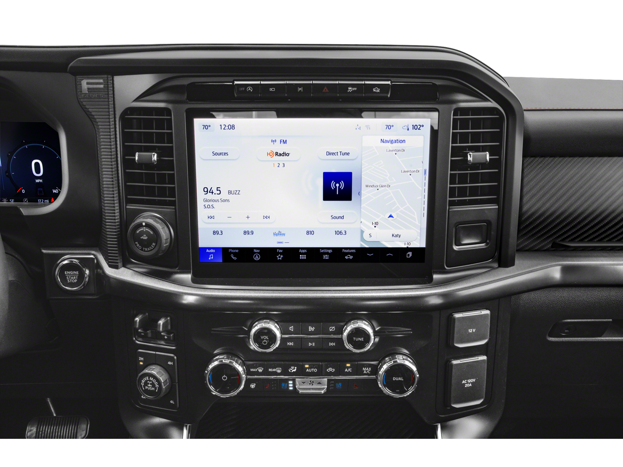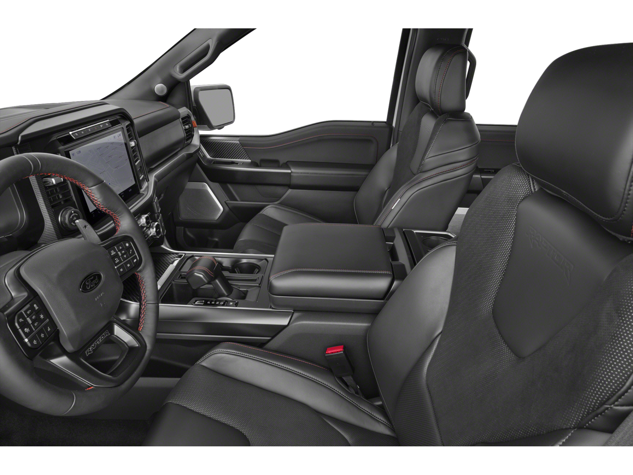 Climb inside the Raptor's cabin and immerse yourself in a world of premium comfort and cutting-edge technology. The RECARO Alcantara Suede front seats, heated steering wheel, and dual-zone automatic climate control create an unrivaled driving experience. Stay connected with the SYNC 4 infotainment system, complete with enhanced voice recognition and a premium B&O sound system.