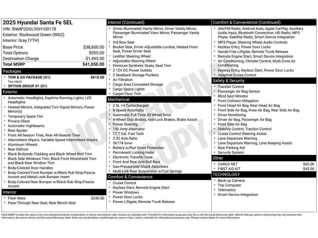 This unit offers Apple CarPlay for seamless connectivity. The leather seats in this unit are a must for buyers looking for comfort, durability, and style. This vehicle has a clean CARFAX vehicle history report. It offers Android Auto for seamless smartphone integration. This mid-size suv offers Automatic Climate Control for personalized comfort. Never get into a cold vehicle again with the remote start feature on the Hyundai Santa Fe. Bluetooth® technology is built into this vehicle, keeping your hands on the steering wheel and your focus on the road. See what's behind you with the back up camera on this 2025 Hyundai Santa Fe . This vehicle is equipped with all wheel drive. Quickly unlock this model with keyless entry. This vehicle shines with a refined green finish. Maintaining a stable interior temperature in the vehicle is easy with the climate control system. This 2025 Hyundai Santa Fe has a 4 Cyl, 2.5L high output engine.