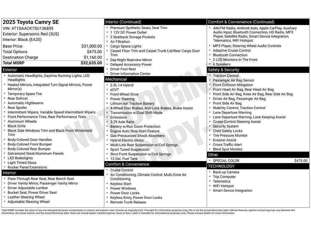 2025 Toyota Camry Hybrid SE — Low Mileage, Best Price in Florence SC Looking for a reliable, fuel-efficient sedan in Florence SC? This 2025 Toyota Camry Hybrid SE with just 21,170 miles offers exceptional value and the best price in the area. Powered by a 4-cylinder 2.5L Full Hybrid Electric (FHEV) engine with Front-Wheel Drive, this Camry blends strong fuel economy with smooth, responsive performance ideal for daily commuting and long drives. Key Highlights: - Low mileage: 21,170 miles — gently pre-owned and well-maintained. - Powertrain: 4 Cyl, 2.5L Full Hybrid Electric (FHEV) with efficient FWD. - Ownership and history: CARFAX Clean Report and CARFAX 1-Owner for peace of mind. - Comfort and convenience: Automatic Climate Control keeps the cabin just right. - Connectivity: Hands-Free Bluetooth® for safe, convenient calling and audio streaming. - Safety and parking: Back-Up Camera for easier maneuvering and added confidence. This Toyota Camry Hybrid SE delivers a refined interior, advanced hybrid technology, and Toyota's reputation for longevity. Located in Florence SC, this vehicle is competitively priced to move quickly — offering the best price for this model and condition in the region. Contact us today to schedule a test drive and see why this 2025 Toyota Camry Hybrid SE is the smart choice for eco-conscious drivers wanting performance, comfort, and exceptional value.
