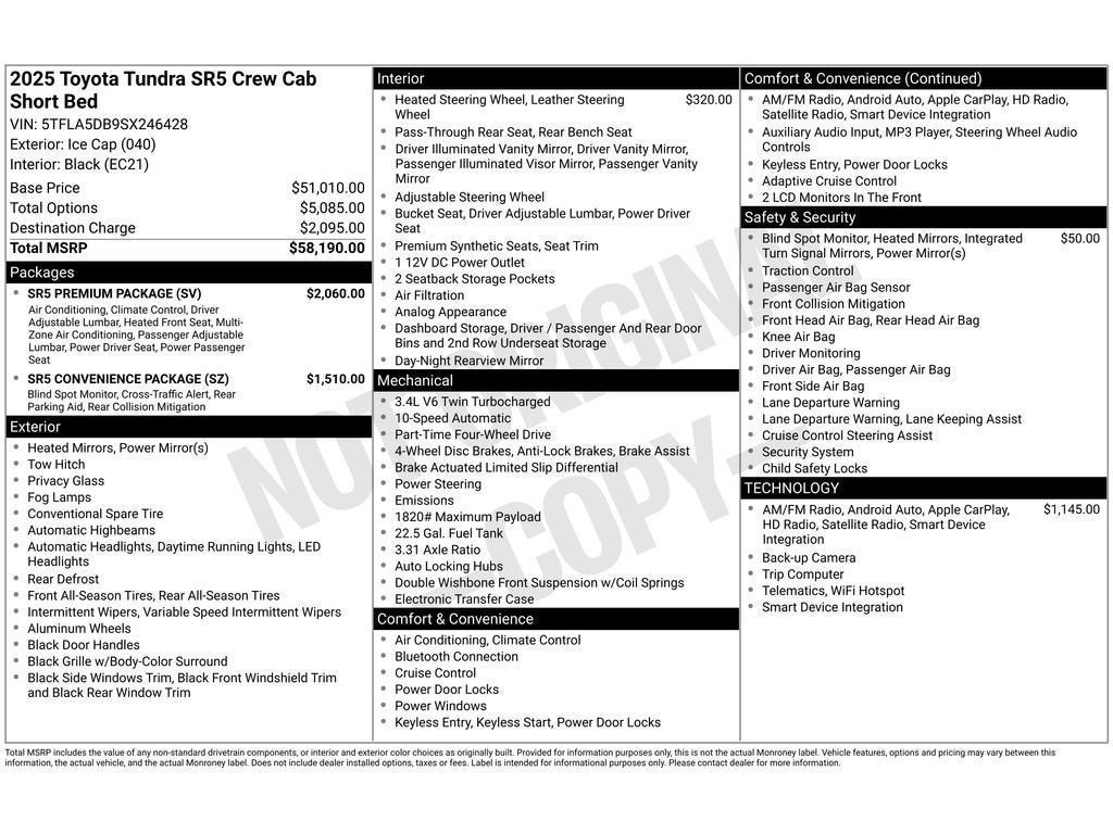 SR5 Convenience Package: 122L Fuel Tank; Blind Spot Monitor with Lane Change Assist; Parking Support Alert/brake SR5 Premium Package: Automatic Power Tailgate with Easy Closing; SofTex Seat Trim; 8-Way Power-Adjustable Heated Front Seats Premium Audio Heated Leather Steering Wheel Heated Power Black Outside Mirrors **Equipment listed is based on original vehicle build and subject to change. Please confirm the accuracy of the included equipment by calling the dealer prior to purchase.**